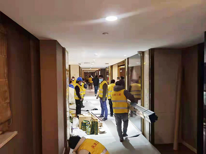 根據(jù)天津市疫情防控指揮部要求,將近兩萬平方米,200余間的客房改造任務(wù)必須在24小時(shí)內(nèi)完成并交付使用,時(shí)間緊、責(zé)任重,工作量大。全體參戰(zhàn)黨員干部身兼重任,牢記“疫情就是命令、防控就是責(zé)任”的要求,黨總支書記趙善伯、支部書記劉鈁親自上手,帶領(lǐng)黨員干部分層、分段負(fù)責(zé),連續(xù)18個(gè)小時(shí)徹夜奮戰(zhàn),更換所有共同區(qū)域地膠、樓梯間、疫情通道隔墻板,設(shè)置各樓層消殺照明、應(yīng)急照明等設(shè)施,提前兩個(gè)小時(shí)干凈整潔交付給市疫情防控指揮部,得到了市疫情指揮部、河西區(qū)住建委、酒店管理的高度肯定和贊揚(yáng)。