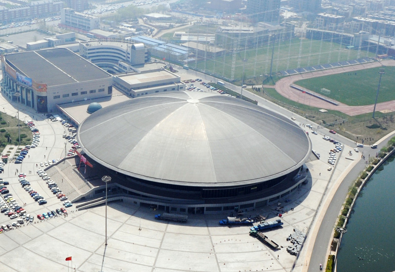天津市體育中心主館,建筑面積29754 m2,造型為飛蝶狀的圓型建筑,高35m,直徑為135m,為全現(xiàn)澆砼框架結(jié)構(gòu),屋面為雙層球冠網(wǎng)殼。該館設(shè)有固定座席7000個(gè),活動(dòng)座席2000個(gè),內(nèi)設(shè)200m室內(nèi)田徑場(chǎng),可提供室內(nèi)田徑和高臺(tái)體操、藍(lán)球等30多項(xiàng)比賽和訓(xùn)練。是目前亞洲最大的綜合體育館。天津市體育中心主館為舉世矚目的第四十三屆世乒賽的重點(diǎn)建設(shè)項(xiàng)目。1992年10 月 28日開工,1994年10月15日竣工。