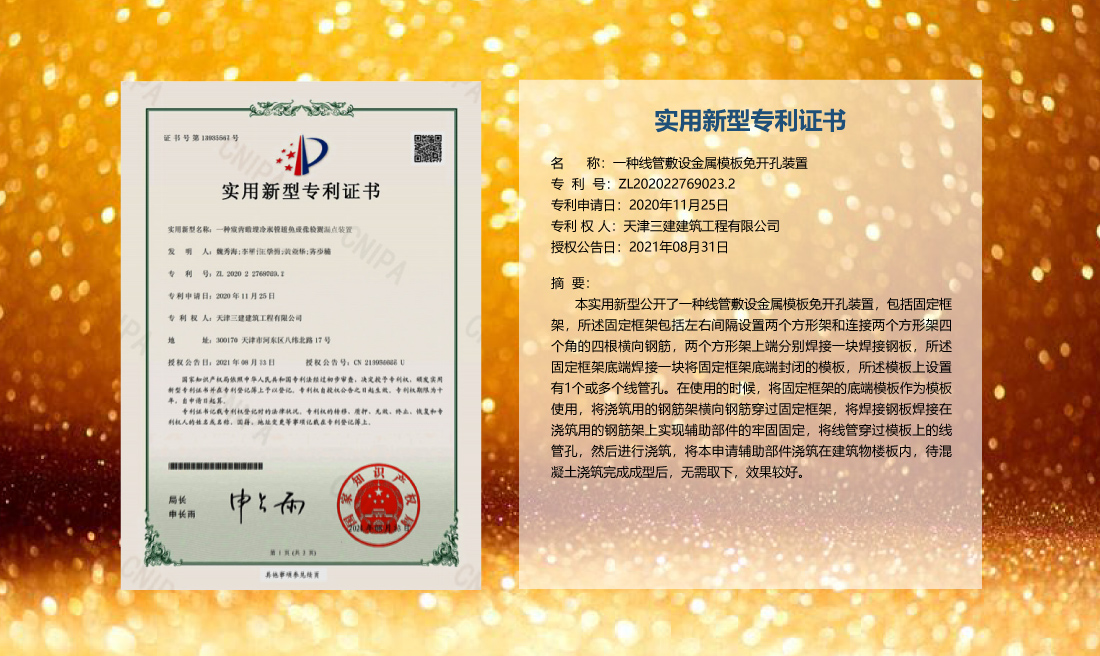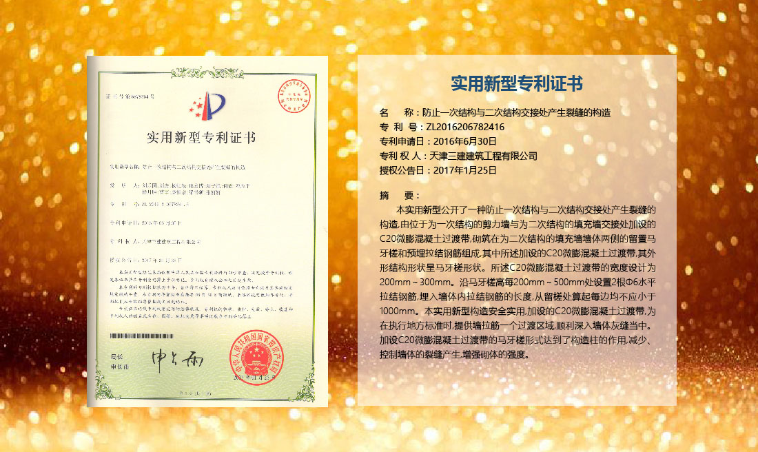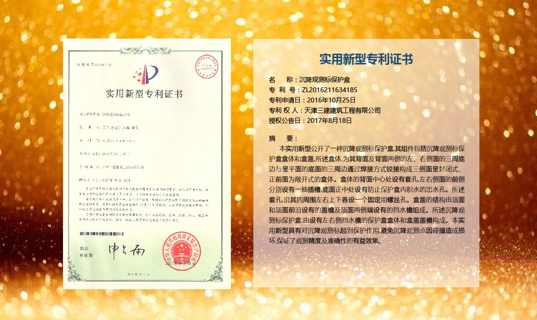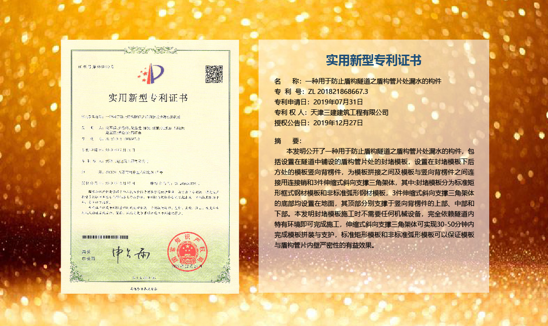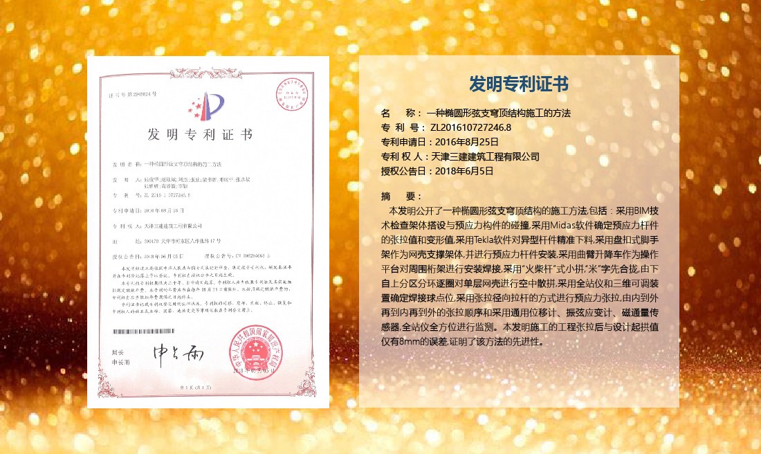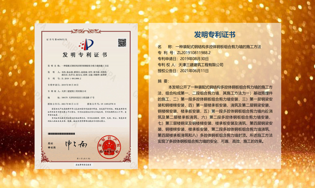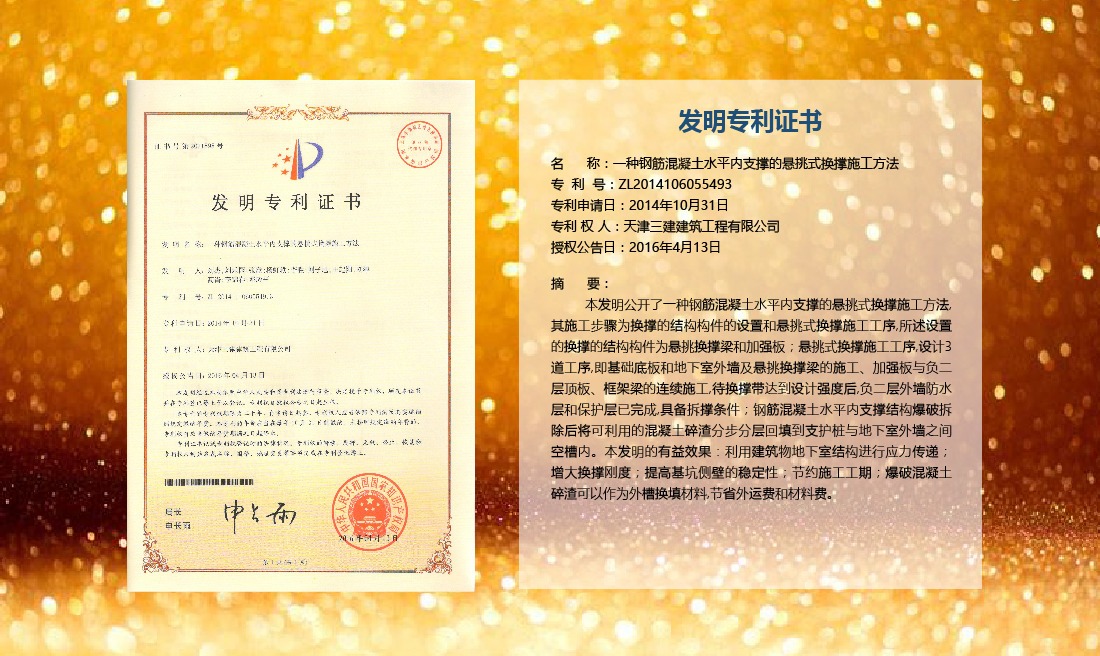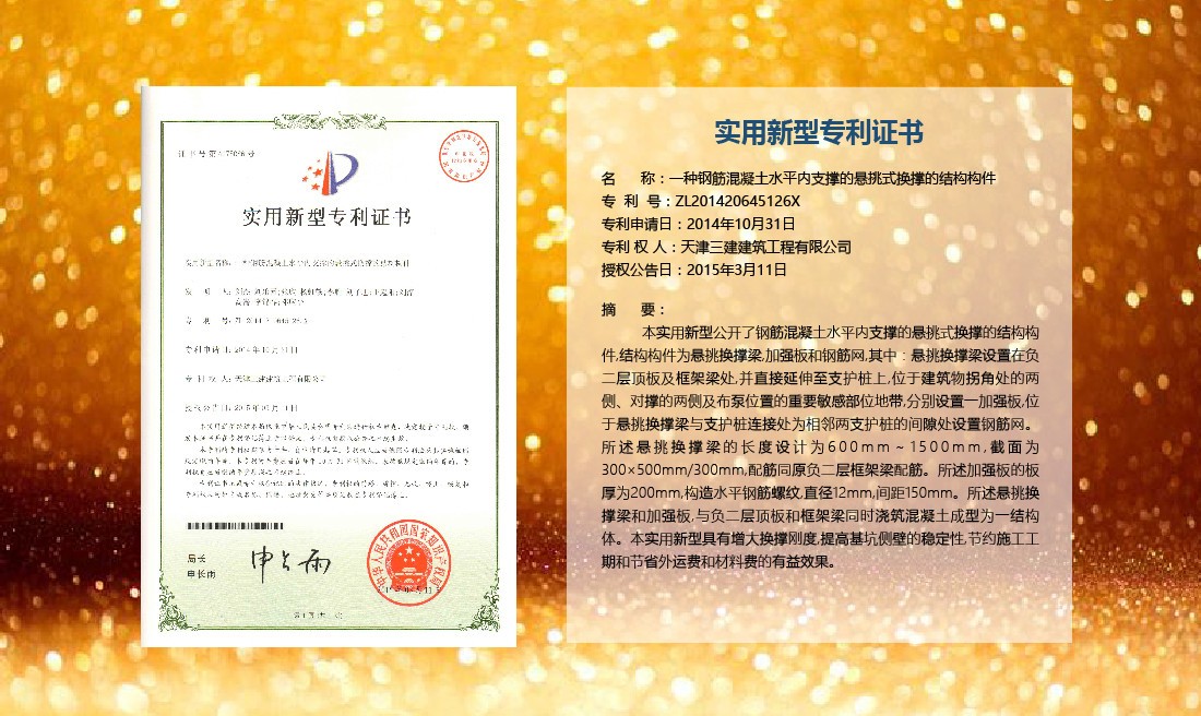 三建公司在總結(jié)施工經(jīng)驗(yàn)的基礎(chǔ)上,不斷發(fā)明創(chuàng)新,共獲得國(guó)家知識(shí)產(chǎn)權(quán)局授權(quán)專利71項(xiàng),其中,國(guó)家發(fā)明專利12項(xiàng),國(guó)家實(shí)用新型專利59項(xiàng)。囊括建筑、市政、巖土、道橋等多領(lǐng)域,凝聚了公司廣大工作人員的寶貴智慧和工程建筑者們的辛勤汗水。