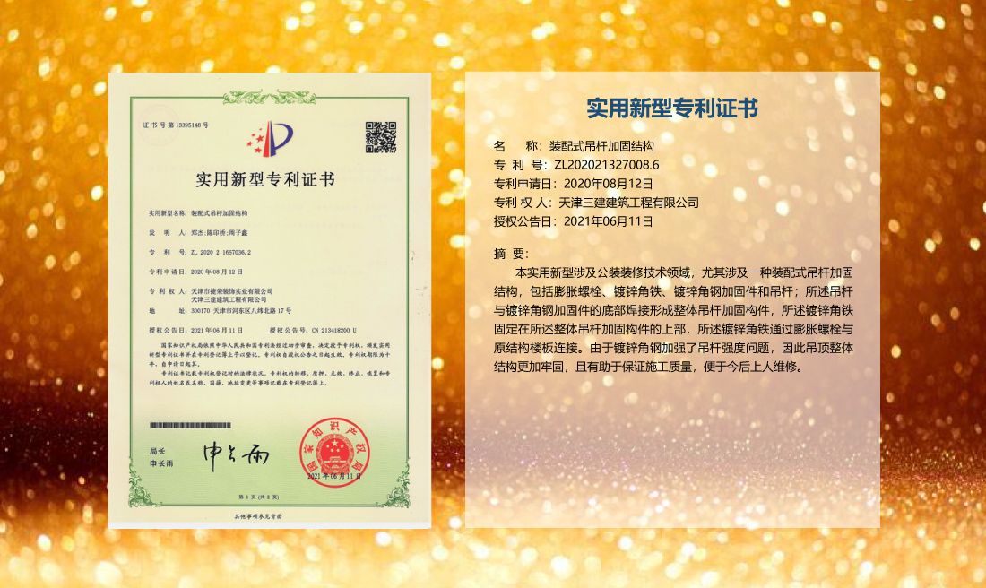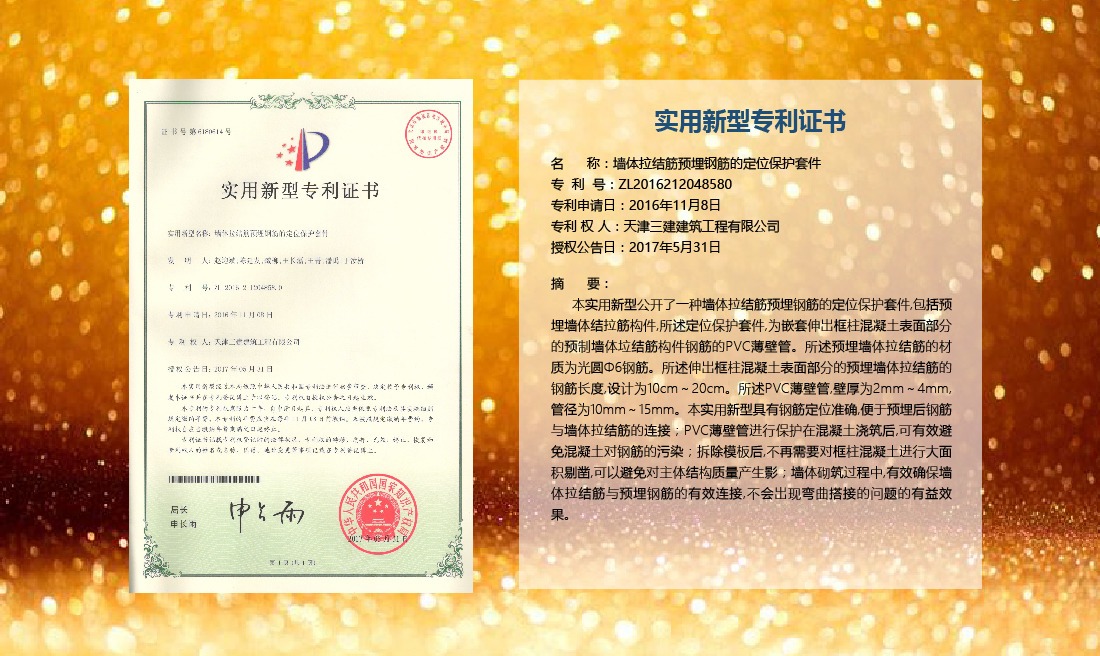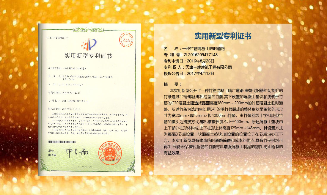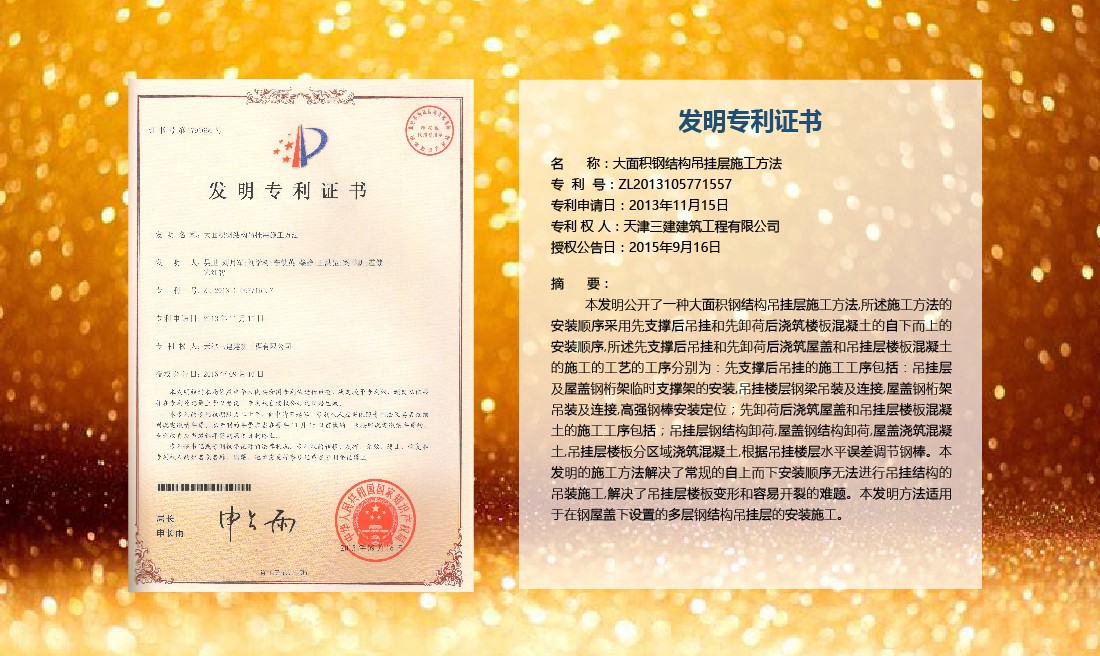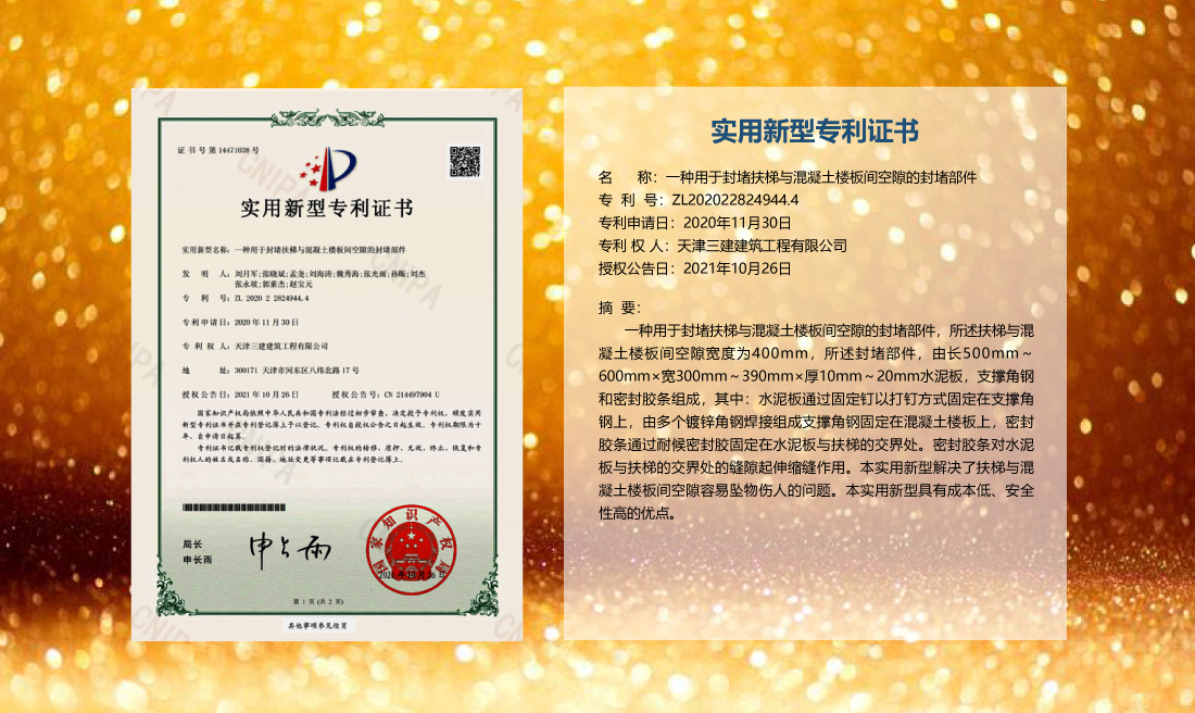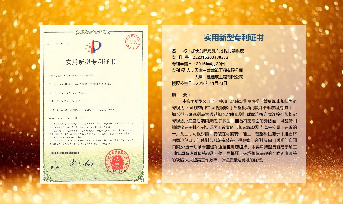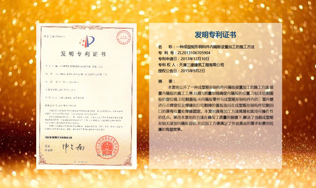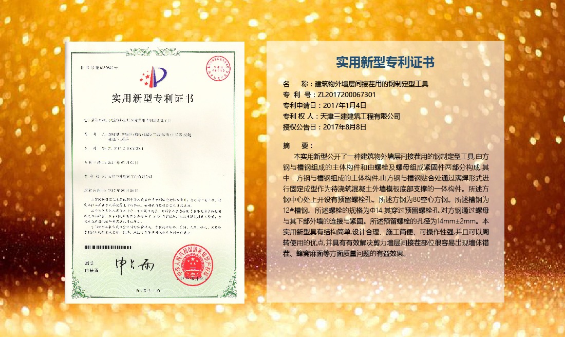 三建公司在總結(jié)施工經(jīng)驗(yàn)的基礎(chǔ)上,不斷發(fā)明創(chuàng)新,共獲得國(guó)家知識(shí)產(chǎn)權(quán)局授權(quán)專利71項(xiàng),其中,國(guó)家發(fā)明專利12項(xiàng),國(guó)家實(shí)用新型專利59項(xiàng)。囊括建筑、市政、巖土、道橋等多領(lǐng)域,凝聚了公司廣大工作人員的寶貴智慧和工程建筑者們的辛勤汗水。